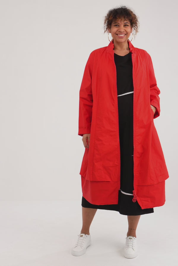 Wenn der Himmel launisch ist, bleibt „Auria“ gelassen. Der Stehkragen schützt angenehm, der 2-Wege-Reißverschluss sorgt beim Gehen, Radeln oder Sitzen für Komfort und Flexibilität. Teilungsnähte modellieren subtil, während der charakteristische Lagen-Saum dem cleanen Design eine modische Tiefe gibt.