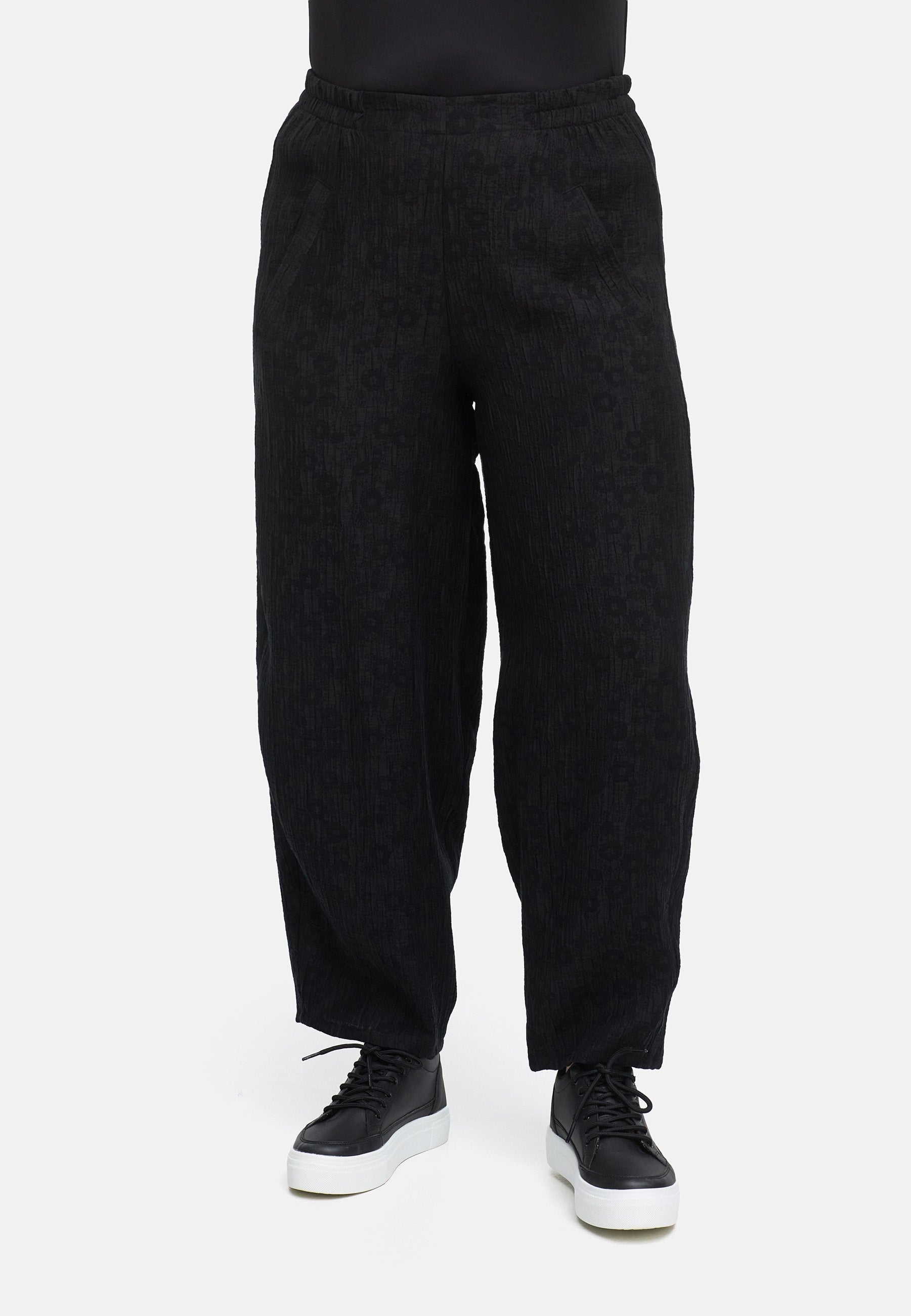 Eine Hose, die Eleganz und Komfort vereint. Schwarzes Jacquard-Muster trifft auf lockeren Schnitt – ein echter Allrounder für stilvolle Herbst-Looks.